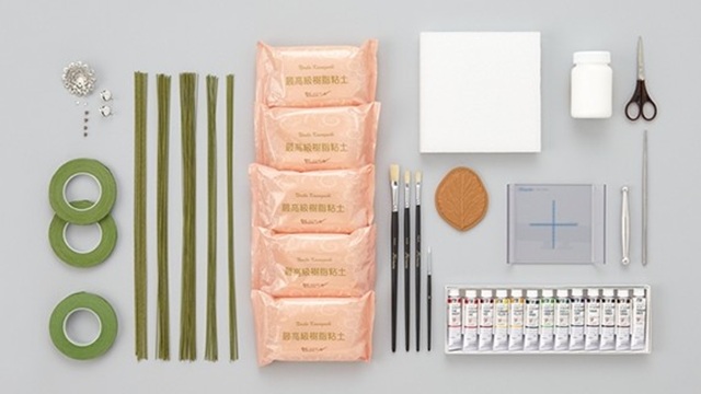 教材は届いたらすぐに作れるを前提に、樹脂粘土、絵の具、ワイヤー、フローラルテープ、葉型、細工棒や丸め棒、ねんど用ハサミ、作業マット、ボンド、筆などが一式届きます。