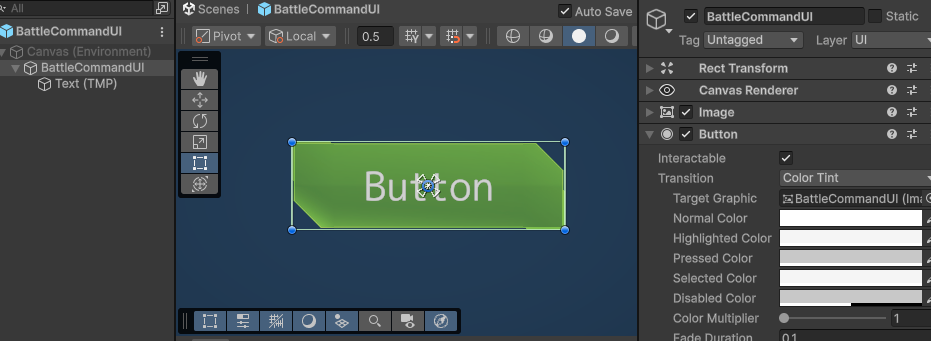 ただし、このButtonコンポーネントは「クリックやタップを検知して処理を呼び出す」という最低限の機能しか持ち合わせていないので、もう少し複雑な動作やアニメーションを付与したい場合は自分でスクリプトを作成する必要があります。そこで作ったのが先ほどのBattleCommandUIクラスという訳です。