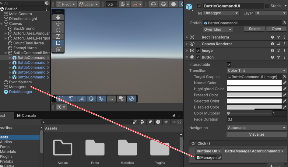 (プレハブ編集画面ではシーン上のオブジェクトを参照にとれないので、一度プレハブ編集画面から出て、シーン上のBattleCommandUIオブジェクトに対してこの設定をする必要があります。勿論この場合プレハブ自体への設定は変更されません。)