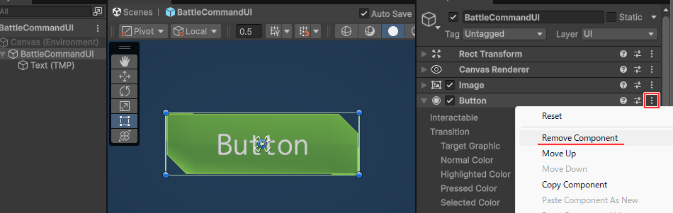 それではBattleCommandUIプレハブの編集画面に戻り、Buttonコンポーネントタブ右上にある縦向きの[…]ボタンをクリックし、Remove Componentを選択します。これでコンポーネントの削除が可能です。