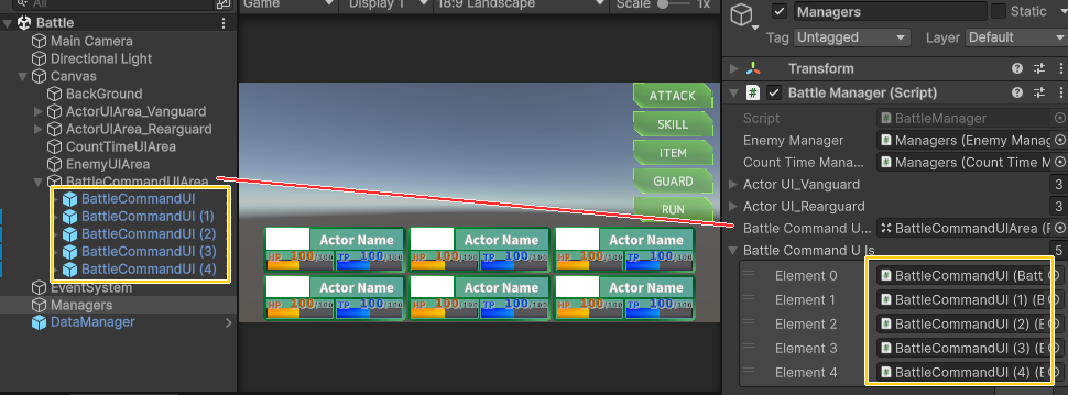 ManagersオブジェクトのBattleManagerコンポーネントからも各種参照をセットします。