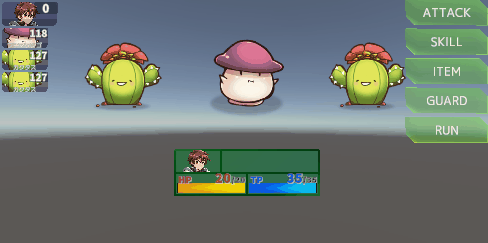 この状態でテストプレイすれば、エネミーにターンが周ってきたときにそのエネミーが行動し、一撃でアクターを倒すのを確認できます。