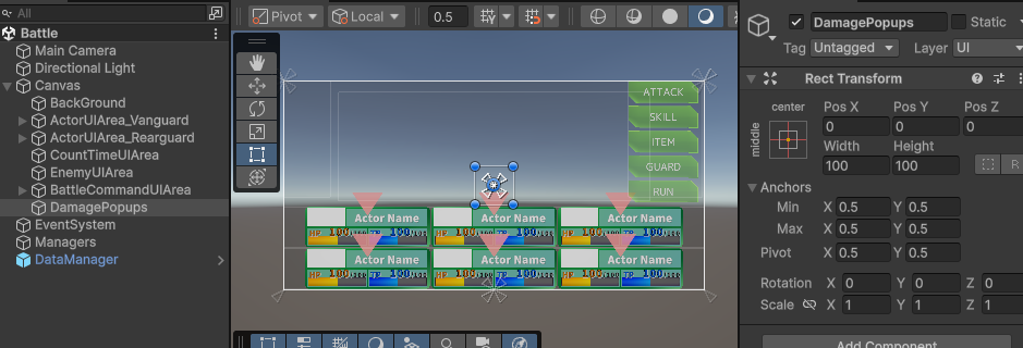 ダメージポップアップのUIオブジェクトを出現させるときの親にする空オブジェクトとしてDamagePopupsを作成します。Inspectorからの設定は不要です。