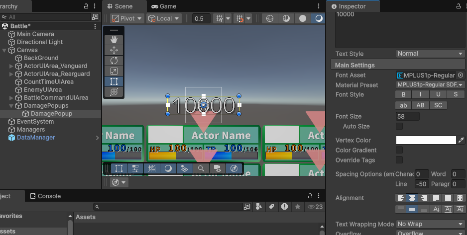 後述しますが、TextMeshProのRichText機能を使うことで1つのTextMeshProオブジェクト内でも「文章の特定の範囲内だけサイズや色を変更する」ということが可能です。後ほどC#スクリプトからこの性質をダメージ表示処理に活用します。
