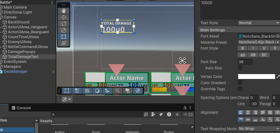 1攻撃あたりの総合ダメージ量を表示するTextMeshProオブジェクト、TotalDamageTextをCanvasの子オブジェクトとして作成します。
