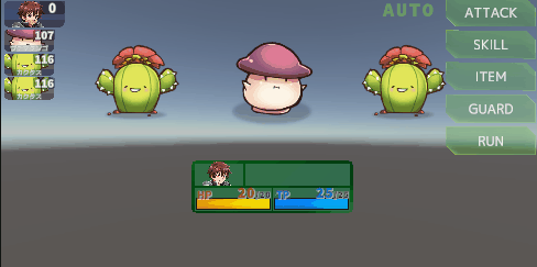 今回はエネミーの行動や複数ターゲット設定、状態異常の処理やオートバトル設定など、戦闘に関する様々なシステムの実装を進めました。
