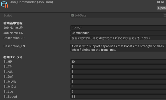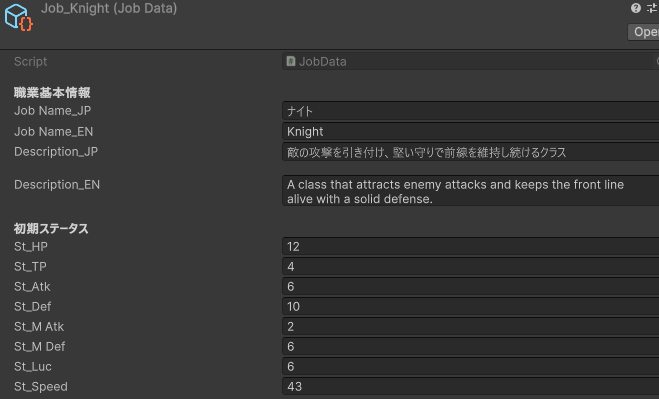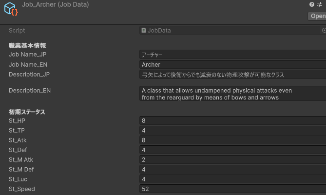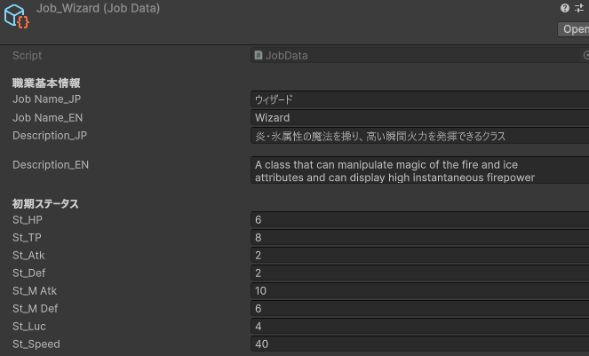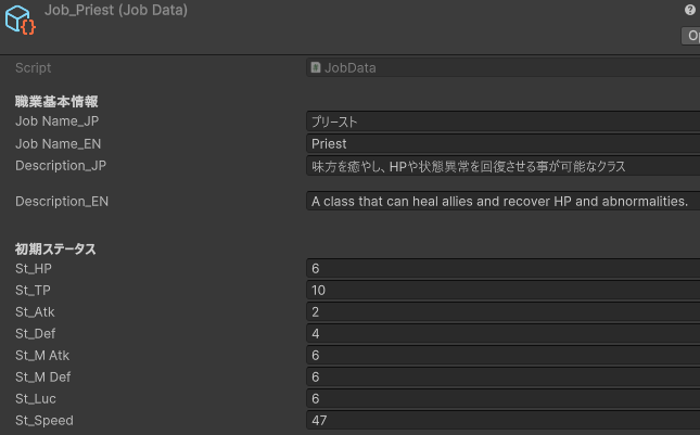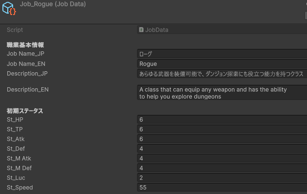 まずは職業ごとにステータス初期値の設定と職業名、職業の説明文章を入力できるようにします。