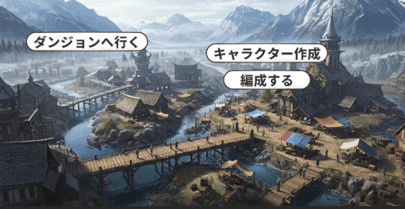 2章にまたいで街シーンとその機能を実装しました。現在はキャラクター作成と編成、その状態でのダンジョン突入までが行えます。