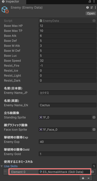 - SkillData.cs:スキル名や効果、使用できる対象や消費TPといったスキルデータを登録できるScriptableObject