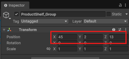 作成した「ProductShelf_Group」を選択し、InspectorのTransformを次のように設定しておきましょう。
