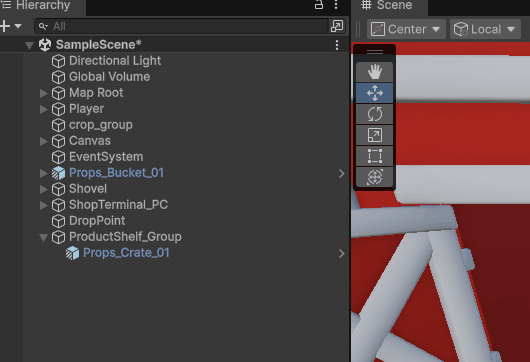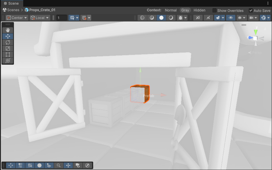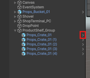 Hierarchyから「Props_Crate_01」の右側にある「>」をクリックし、Prefab編集モードに入りましょう。