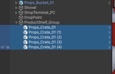 「Props_Crate_01」を見つけたら、それを先ほど作成した「ProductShelf_Group」にドラッグ&ドロップしてください(ProductShelf_Groupの子オブジェクトになるようにします)。