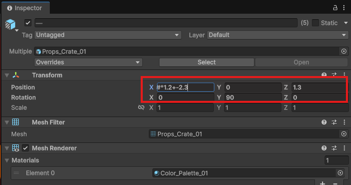 「Props_Crate_01」から「Props_Crate_01 (4)」までを、Shiftキーを押しながらまとめて選択しましょう。複数選択した状態で、InspectorのTransformを以下のように設定します。