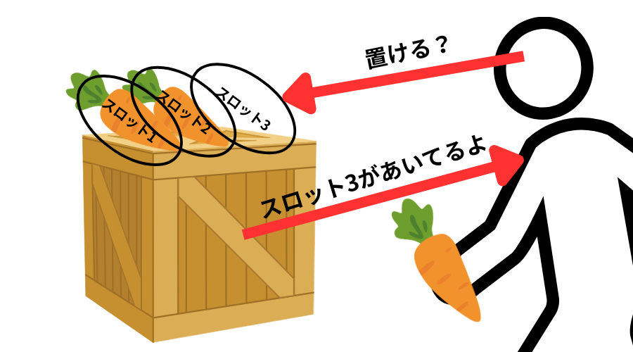 棚には slots(置き場配列)があり、空いているスロットに順番に商品を入れていきます。