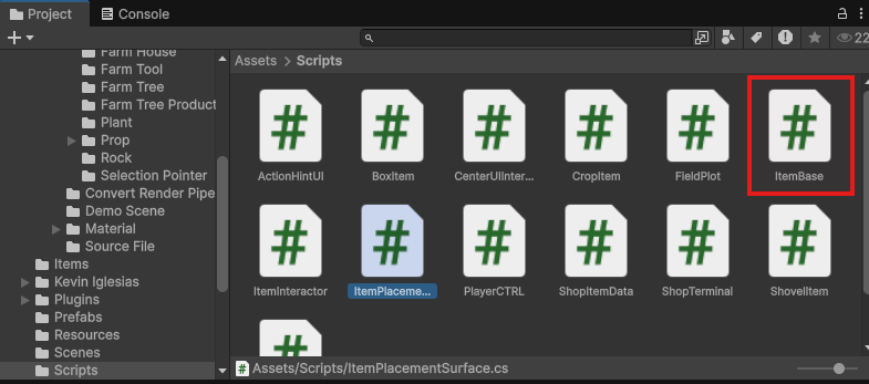 Projectウィンドウから Scripts フォルダを開き、ItemBase を見つけたらダブルクリックして開きましょう。
