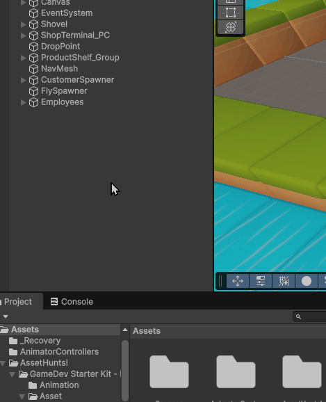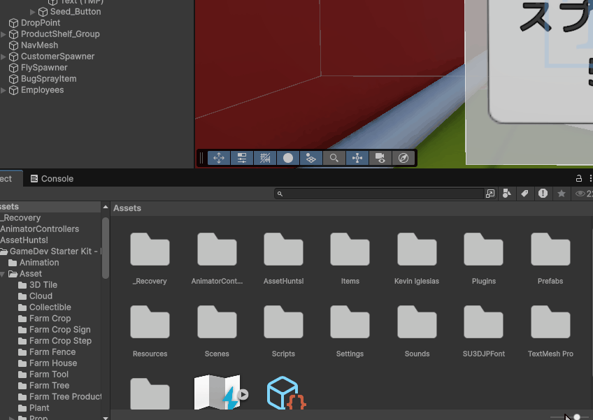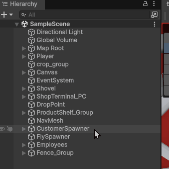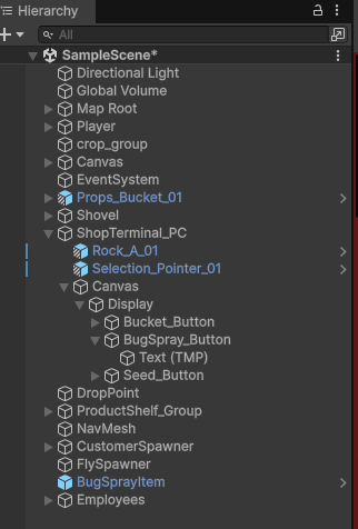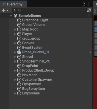 また、今後はショップから購入できるようになるため、Hierarchy上にあるBugSprayItemとProps_Bucket_01は削除しておきましょう。