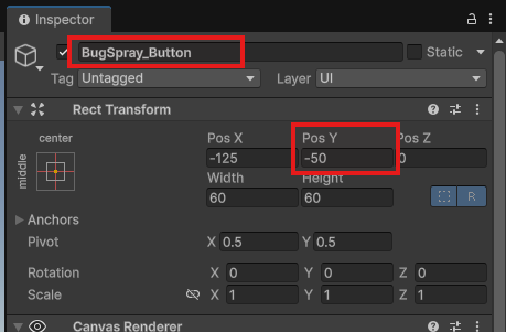 最後に、BugSpray_Buttonを選択し、On ClickにBugSprayを設定しましょう。