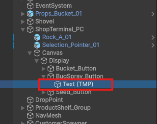 Hierarchy内の「ShopTerminal_PC > Canvas > Display」にある「Bucket_Button」を選択し、Ctrl + Dで複製してください。