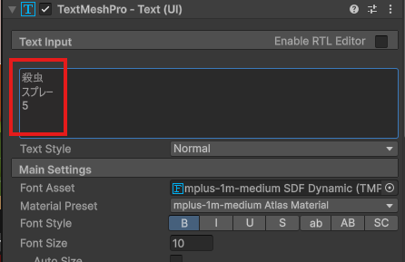 次に、BugSpray_Buttonの子オブジェクトにある「Text(TMP)」を選択し、以下のように変更していきましょう。