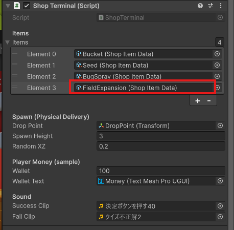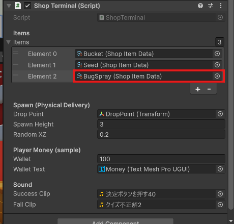 次に、HierarchyでShopTerminal_PCを選択し、ShopTerminalコンポーネントのItemsにBugSprayを追加しましょう。