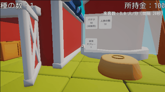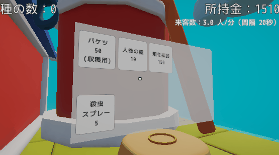 具体的には貯めたお金を使ってショップで施設のレベルアップが行えるようにします。最初は小さな商品棚、狭い畑、なかなか来ないお客さんという厳しいスタートにします。