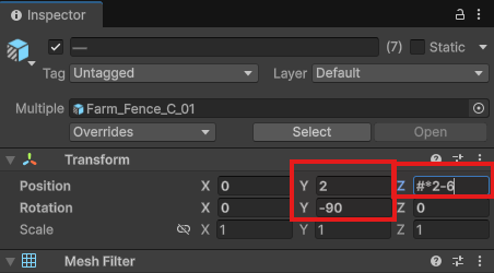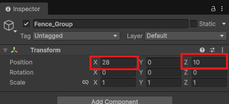 配置したフェンスをすべて選択し、InspectorからTransformを以下のように設定していきましょう。