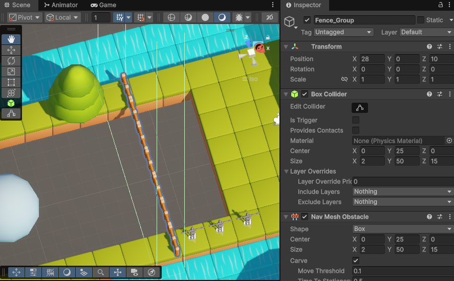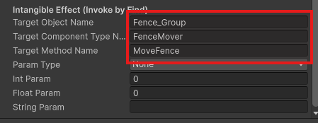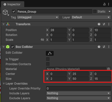 その後、Fence_Groupを選択し、Inspectorから以下のように設定していきます。