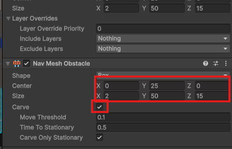• Carve ON にすると、NavMeshに穴を開けてAIエージェントがその領域を通れないようにします