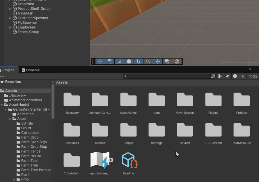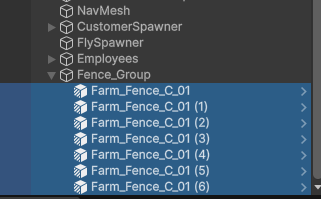 「Assets/AssetHunts!/GameDev Starter Kit – Farming/Asset/Farm Fence」にある「Farm_Fence_C_01」を、Fence_Groupにドラッグ&ドロップしましょう。