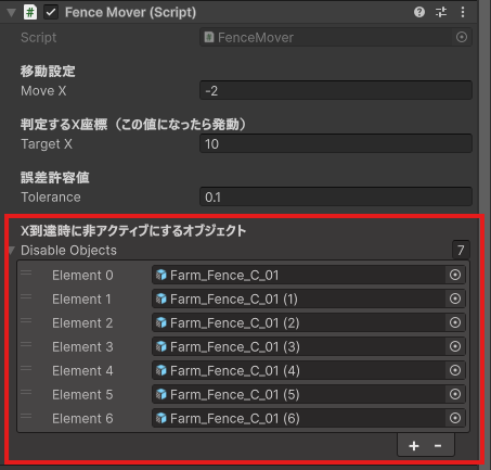 フェンスをどれだけX方向に動かすかを決めます。Unity画面でフェンスのX位置を試しに変更してみるとたしかにマイナス方向に動かせば使える畑のスペースが増えることが確認できます。