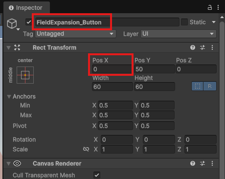 複製した「Seed_Button (1)」を選択し、Inspectorから名前を「FieldExpansion_Button」に変更して、以下のように設定していきましょう。