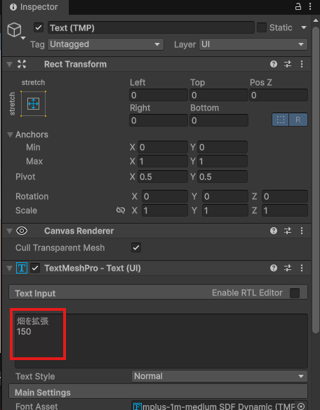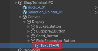つぎにFieldExpansion_Buttonの子オブジェクトにあるText (TMP)を選択してテキストを以下のように変更しましょう。
