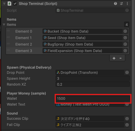 再生中にShopTerminal_PCを選択し、ShopTerminalコンポーネントのWalletを1500に設定します。