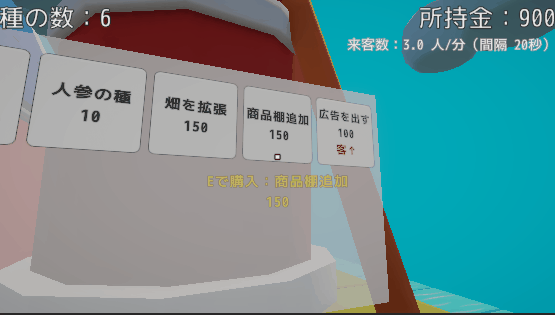そこで、商品棚も購入によって少しずつ増やせるようにし、ゲームバランスを調整していきましょう。