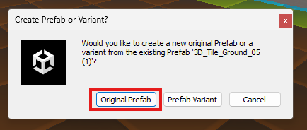 今回は、元となる地面オブジェクトをそのままPrefab化したいので、こちらを選びます。