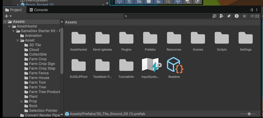 Hierarchyから「Map Root > Field > 3D_Tile_Ground_05 > 3D_Tile_Ground_05 (1)」を探し、作成した「Prefabs」フォルダにドラッグ&ドロップしましょう。