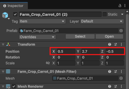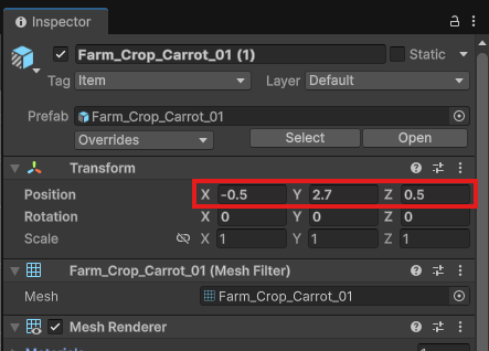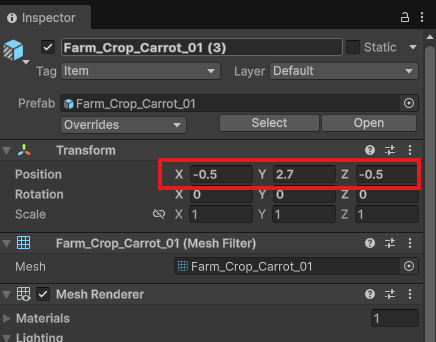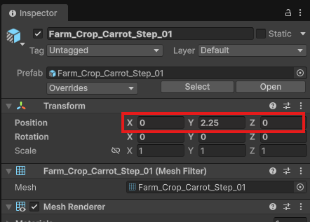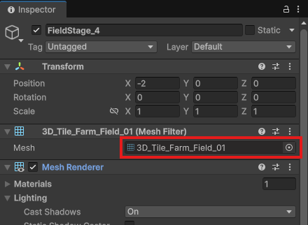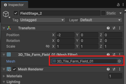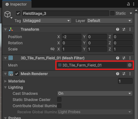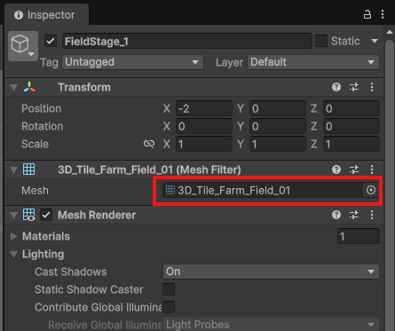FieldStage_1, 2, 3と同様にInspectorから、Meshを「3D_Tile_Farm_Field_01」に変更しましょう。