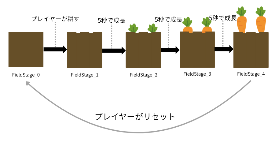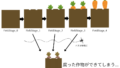 種を植える→芽が出る→成長する→にんじんが生える→収穫という一連の流れを作成していきましょう。