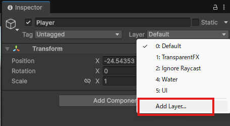 Inspector上部にある Layer のドロップダウンをクリックします。