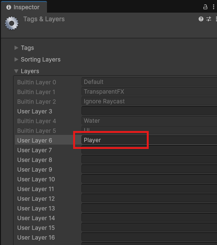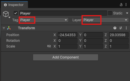 Inspector上部にある Tag と Layer をそれぞれ「Player」に設定してください(TagとLayerのPlayer設定を忘れると次章以降のスクリプトが動かなくなります)。