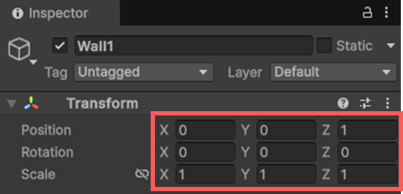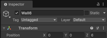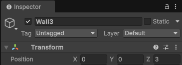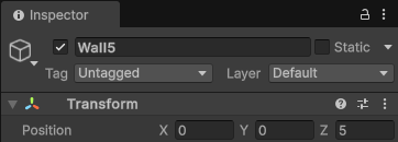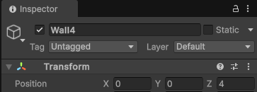 新しく作成された空のオブジェクトの名前を[Wall1]に変更し、Inspectorビューで位置などを設定します。
