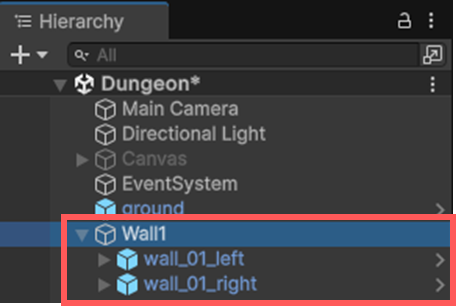 AssetStoreからインポートした、[Stylized Dungeon – Free Pack]→[Prefabs]→[wall_01]を先ほど作成したWall1オブジェクトに2回ドラッグアンドドロップします。それぞれの名前を[wall_01_left]と[wall_01_right]に変更します。