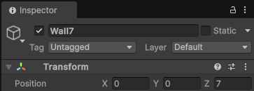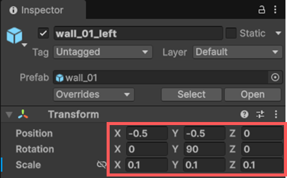 wall_01_leftオブジェクトをクリックして、Inspectorビューを表示し、次のとおり設定します。
