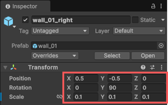 wall_01_rightオブジェクトをクリックして、Inspectorビューを表示し、次のとおり設定します。