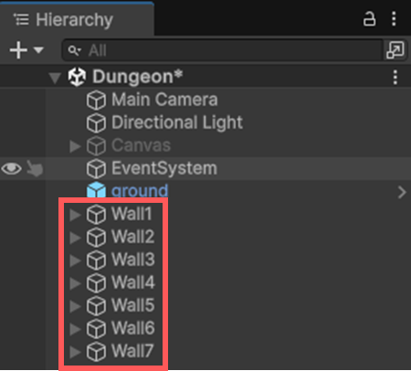 この壁オブジェクトを複製して並べることで、ダンジョンの通路を表現します。