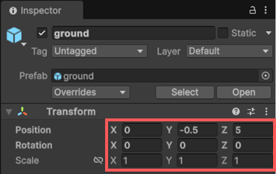 HierarchyビューにあるgroundをクリックしてInspectorビューを表示し、以下のとおり設定します。