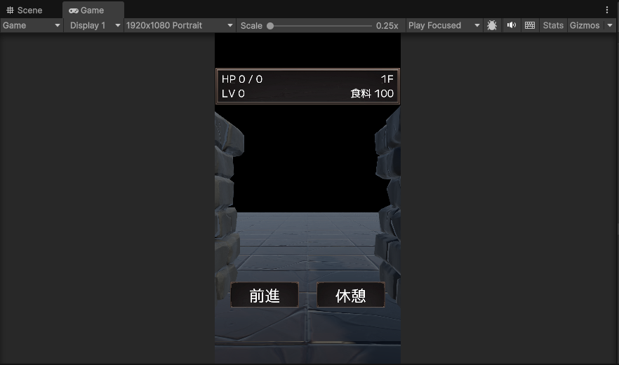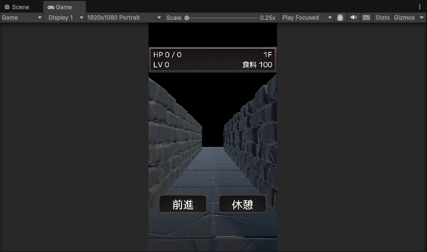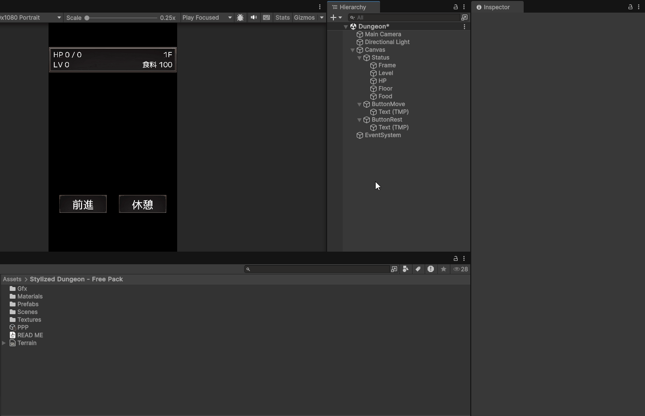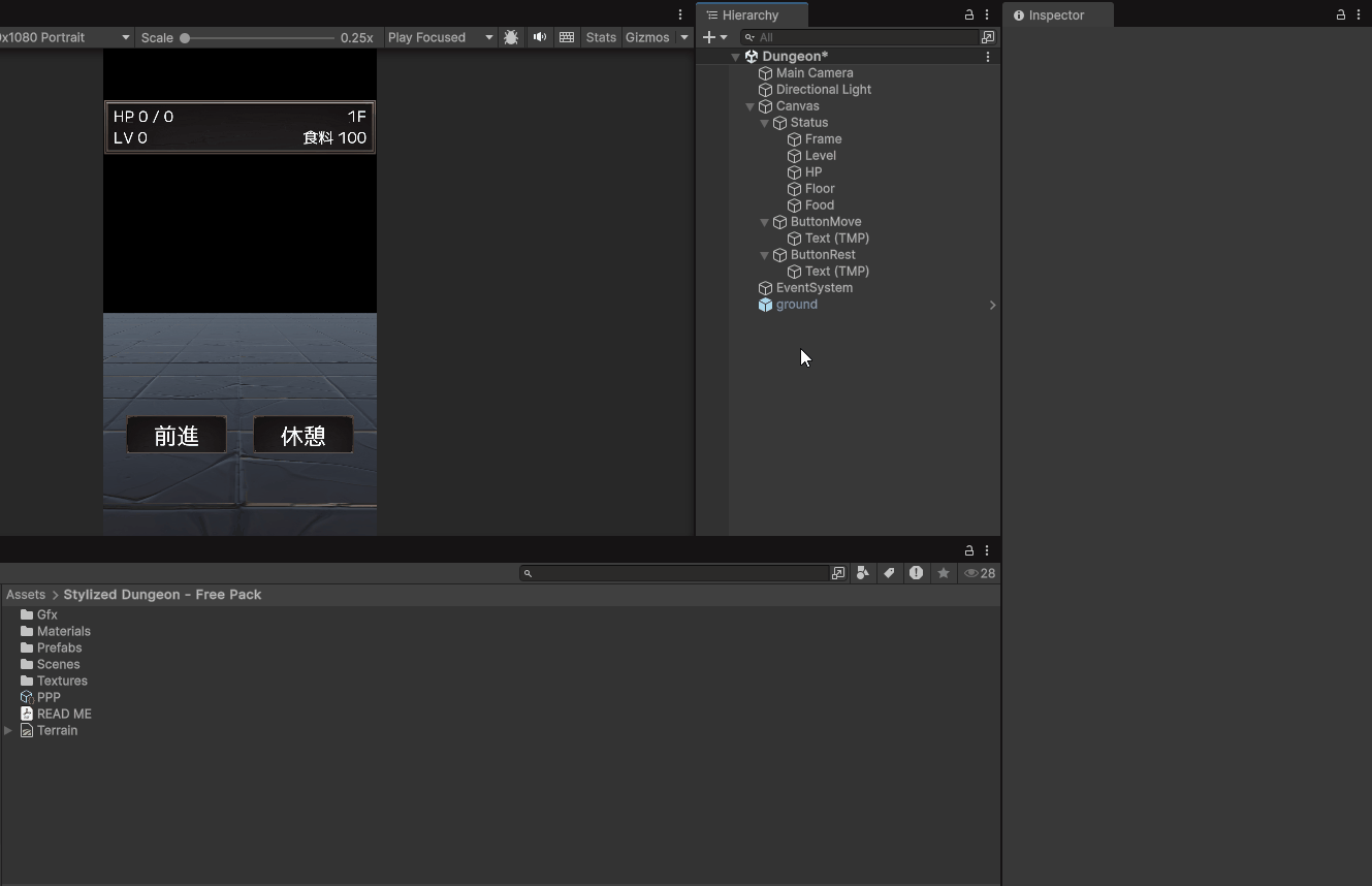 前回はダンジョンシーンの作成とステータスUI・行動ボタンの作成を行いました。