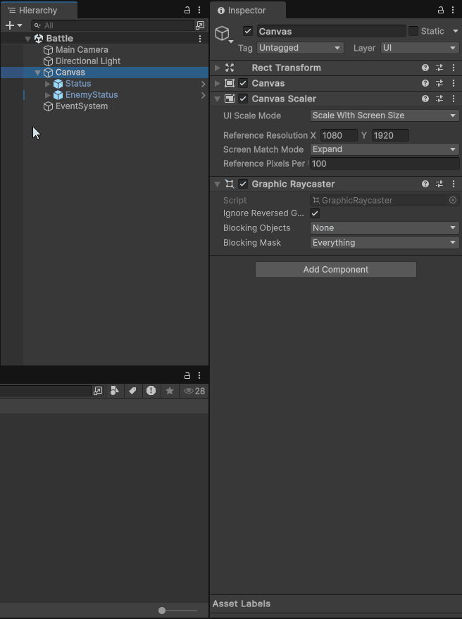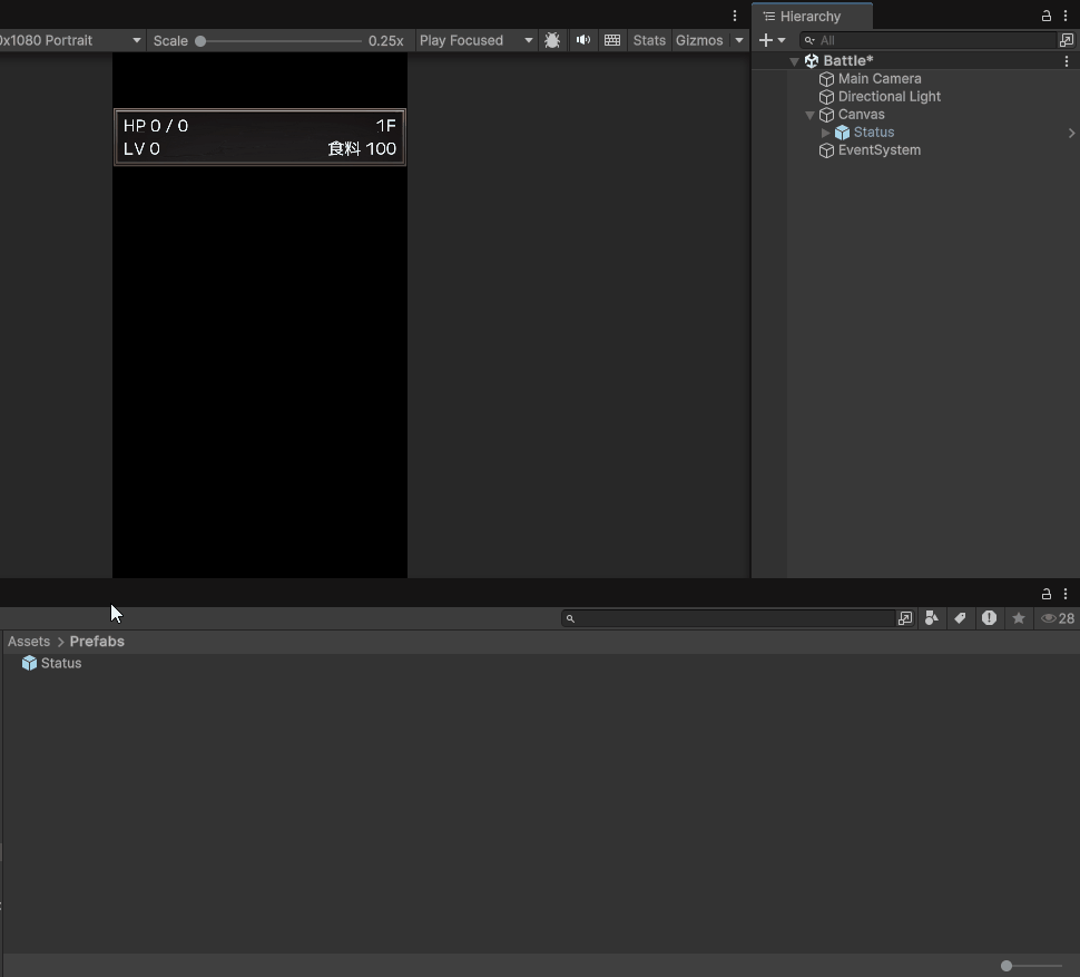 [Reference Resolution]のXを1080にYを1920に変更します。 [Screen Match Mode]を[Expand]に変更します。他のシーンと同じですね。 [Assets/Prefabs]フォルダにあるStatusプレハブを、HierarchyビューにあるCanvasオブジェクトにドラッグアンドドロップします。