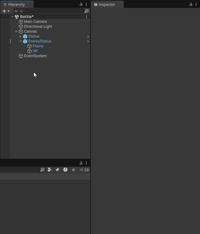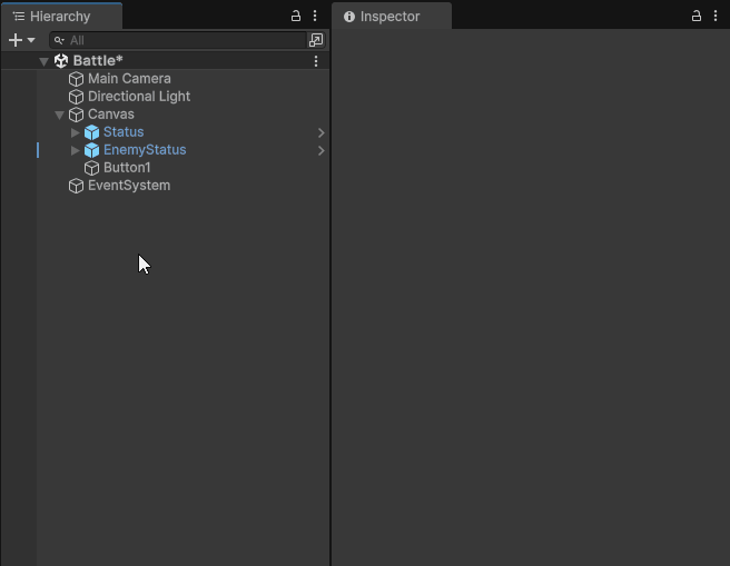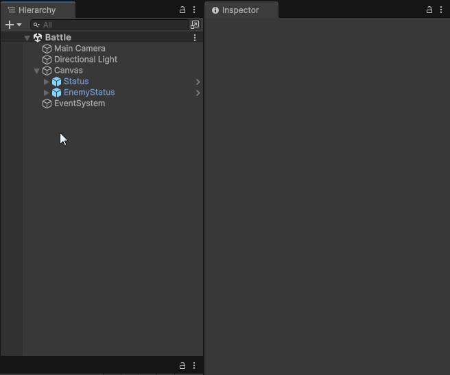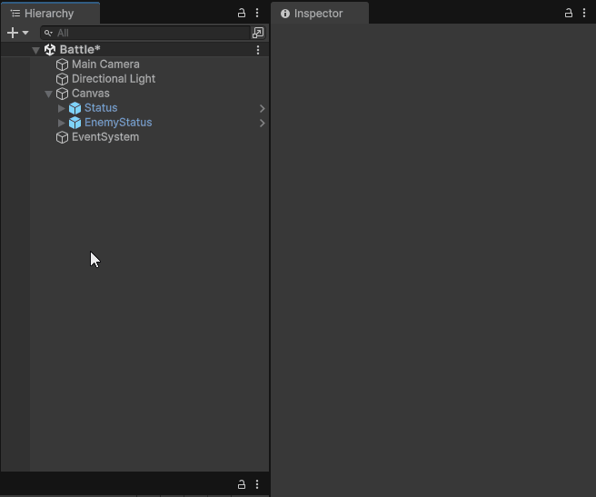 [Assets/Prefabs]フォルダにあるStatusプレハブを、HierarchyビューにあるCanvasオブジェクトにドラッグアンドドロップし、名前を[EnemyStatus]に変更します。