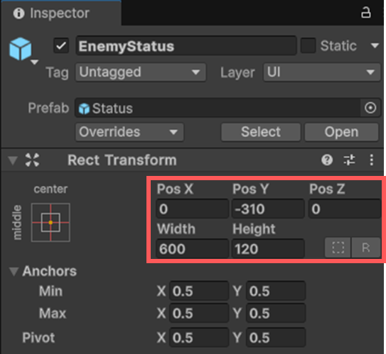 次にEnemyStatusのInspectorビューを表示し、Transformで四角形で描かれているAnchor Presetの設定をShiftキーを押しながらMiddle-Centerに変更します。